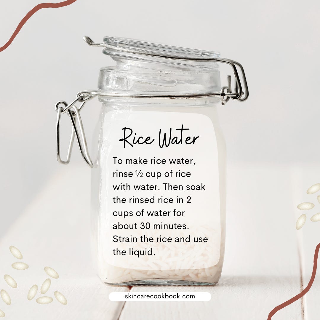 You can use rice water alone as a toner or you can add green tea, glycerin, or essential oils such as lavender, tea tree, or rosemary. Rice water is used to brighten and hydrate the skin as it contains many antioxidants.